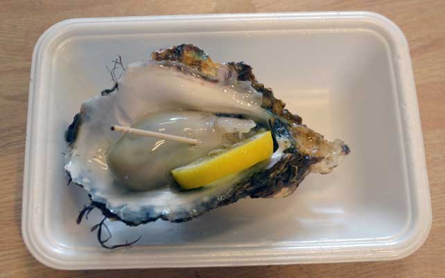 とは言ってもまだこの時間に開いている店はたいしてありません。飲食のお店はまだ開店準備中で、昨日刺身や煮付けを買った魚屋と「番屋鮮魚直売所」の2か所だけです。そこでタイとメバルの昆布締め、ガスエビの天ぷら、バイガイの刺身、活バイ貝を購入しました。続いて直売所をのぞいてまだ動いているスズキがあったのでそれを1匹買って刺身に捌いてもらうのを待つ間に岩ガキを1個食べてみます。うん、美味しい。
