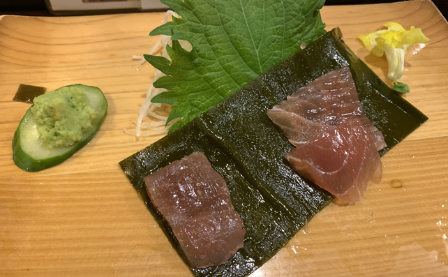 富山で「サス」と呼ばれるカジキを昆布で締めたもの。 |