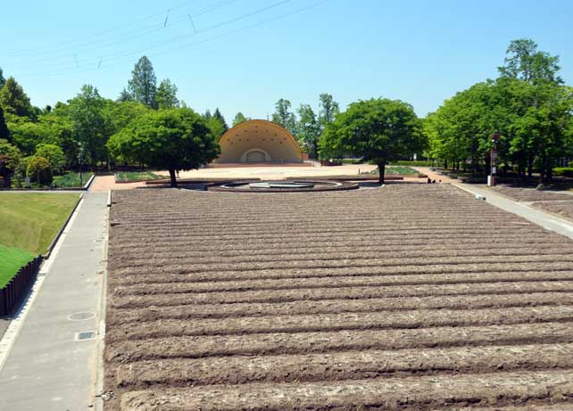そうそう、帰り道、砺波のチューリップ公園に寄ってみるのでしたね。ナビをセットしておよそ15分で到着しました。駐車場はガラガラに空いています。休みじゃないだろうな?入口らしき建物に向かいますが、どこにもチケット売り場らしいところが見当たりません。料金所がないのでそのまま通り過ぎて園内に入ります。園内には池があって周囲に木が植えられています。しかし目に入るはずの赤や黄色などのカラフルな絨毯がどこにもありません。それらしい植物が植えられている区画を見てびっくり!なんと全てのチューリップが首のところからちょん切られているではありませんか。隣の区画も、その隣の区画も・・・とにかくあらゆる区画のチューリップがすべて首切りの刑に処せられていました。チューリップの花だけを切るのは、良い球根を育てるためであると聞いたことがあります。事実、オランダのキューケンホフと言う有名なチューリップ園の周囲にはたくさんの畑があってそこでは花を切られたチューリップが並んでいました。この畑は球根を取って世界に販売するための畑なので、そうする必要があるのでしょう。けれども砺波のチューリップ公園の規模では球根を売ると言ってもわずかな額です。それだけのために全部の花を切ってしまうのはもったいないことではありませんか。