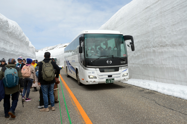 「雪の大谷」とは、10メーターを超えるあたり一面の雪を除雪機によって掘り出してアスファルトの表面まで除雪した、道路そのものです。このアルペンルートはマイカーでは通行できません。マイカーで来た人は富山地方鉄道の立山駅の駐車場に車を置いて、立山駅からケーブルカーで美女平へ、そこからバスに乗って室堂ターミナルへと移動するわけです。さらに室堂から黒部ダム方面に向かう人は、立山駅から長野側の扇沢まで車を回送してくれるサービスもあるそうです。