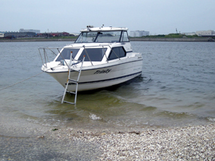 この時期、カレイ釣りの場所は潮干狩りをする三番瀬の沖です。仲間が船を置いているのは船橋なので、出て目と鼻の先の所です。実は彼の船、それまでは船宿の場所を借りていたのですが、漁協が新たに開発した「船橋ボートパーク」に引っ越したばかりです。場所が狭いとは聞いていましたが、確かに彼の23フィート艇の両側に僅かしか余裕がありません。普通は一つの区切りに2艇が入るのですが、ここは1バース1艇です。仕切りはアルミの桁ですが、その上を歩くようには作られていません。あくまでも後の係留索を縛るだけの目的です。