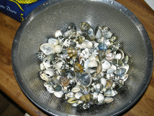 さて、どんな具合かな?おお採れますね。春とは大違いです。ひとかきで2、3個出てくることもあります。それに結構大きいサイズがありますね。中には春の生き残りかと思う大きいものも採れました。2時間ほどでスパゲティ2回分以上は採れましたね。さて、帰るとしましょう。波も穏やかで、日差しも強くなく、とても快適なクルージングでした。もう一回くらい、行きたいなぁ・・・