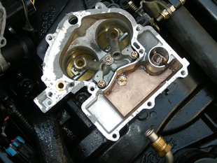 となると残りは問題の水温スイッチです。ここで自分の間違いに気がつきました。サービスマニュアルを見ると、スイッチはサーモスタットハウジングの水温センダーの反対側に付いているのです。これまでブロックの右舷バンクの上についているのがそうだと思い込んでいましたが、ハーネスを追っていくと、これは「ターンキーシステム」というオートチョークに相当する機構につながっているようです。つまりエンジンが暖まったら、ソレノイドでエアバイパスを閉じるのでしょう。水温スイッチはホースの下です。冷却水のインレットとエキマニへのアウトレットホースを外さないとアクセスできません。その上、ロングソケットがないと回せないので、しかたなくスパナで少しずつ緩めます。苦労して外してみると、検知部が茶色いさびで覆われています。とはいってもかさぶたでガビガビではありませんので、これが原因とは思えませんがとりあえず磨いてみましょう。金属ブラシとサンドペーパーで磨いたら、ピカピカの銅色の地肌が出てきました。(写真右上)