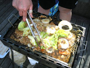 4時に湾奥の運河に帰着して、宴会場となる51フィートの船に横付けしました。この船はレノン号という、普段はチャーターで営業をやっているパーティ船です。ですので広いサロンとキッチンがあり、さらに2階のデッキでも飲食が出来るというすばらしい船です。発電機が回り、暖房が効いた船内にはいると、M船長さんはキッチンで料理の真っ最中。いい匂いがキャビンに漂っています。俄然元気になった私は、空いたキッチンをお借りして差し入れの料理を温めさせてもらいました。